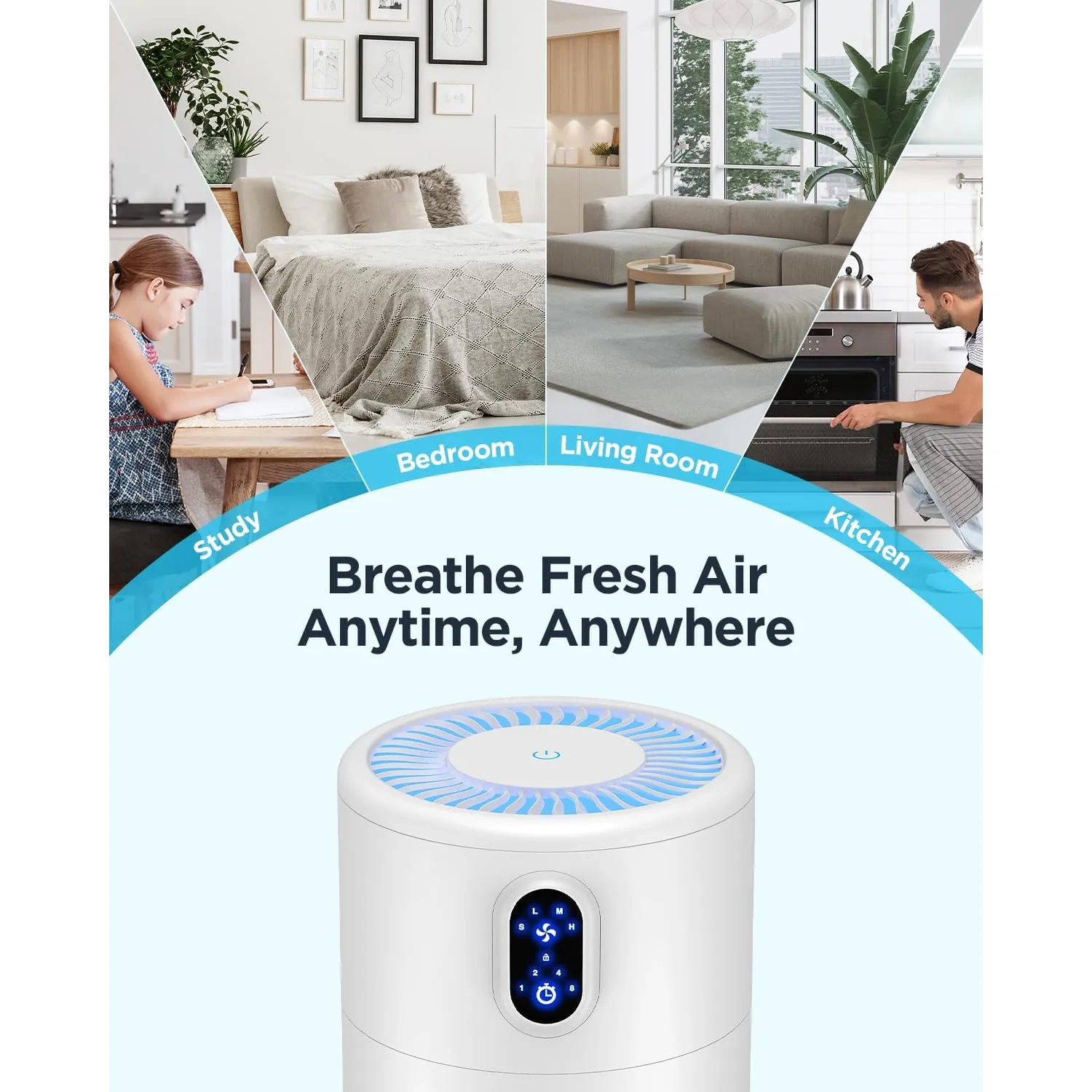 Funciones adicionales: 4 opciones de temporizador (1h, 2h, 4h, 8h) para programar el tiempo de funcionamiento. 4 modos de ventilador (Sleep, Low, Med, High) para ajustar la captura de contaminantes. Luz nocturna suave, que se puede encender o apagar manteniendo el aparato en funcionamiento. Filtro de repuesto recomendado cada 3-6 meses dependiendo del entorno y frecuencia de uso.