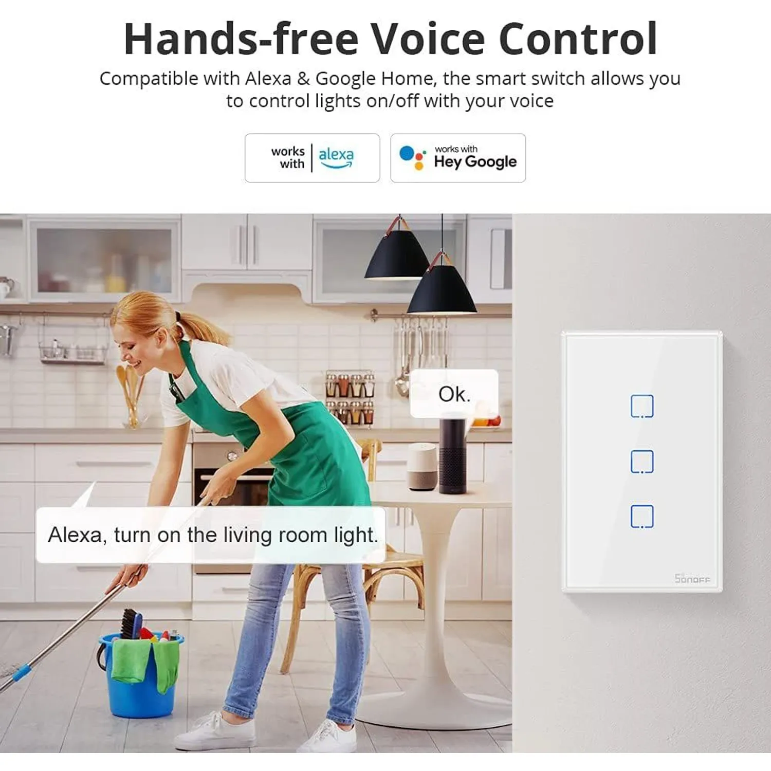 Características principales: Control remoto desde el teléfono para todos los interruptores, cada dispositivo puede operar de manera independiente. Compatible con Amazon Alexa y Google Assistant para control por voz. Botones táctiles sensibles que integran un diseño moderno en la pared. Escenas inteligentes personalizables para activar dispositivos o grupos de dispositivos con un solo toque. Control LAN que asegura funcionamiento estable ante redes WiFi inestables. Integración con IFTTT para comunicación versátil entre dispositivos y servicios. Función de control compartido y monitoreo en tiempo real mediante la aplicación eWeLink.