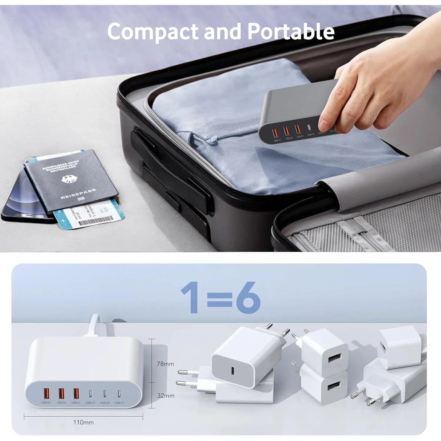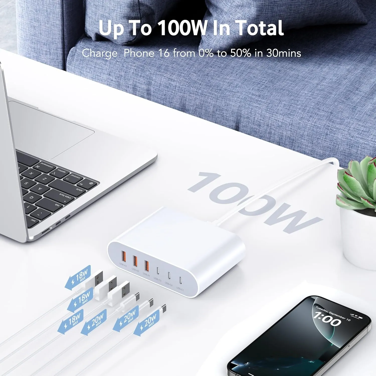 Cargador Rápido Usb C 100w Gan 6 puertos (3 Usb C y 3 Usb A) Estación de carga