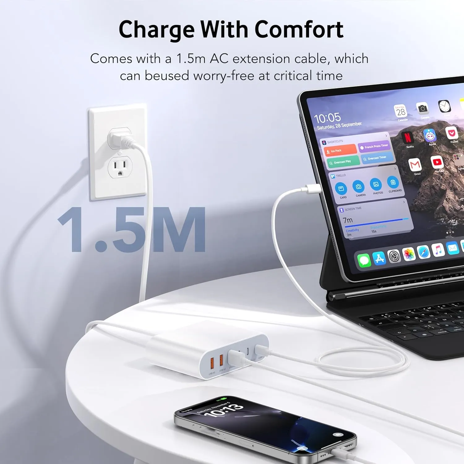 Viene con un cable de extensión de 5 pies que evita restricciones de distancia, permitiendo cargar desde diferentes ubicaciones sin necesidad de estar pegado a un tomacorriente.