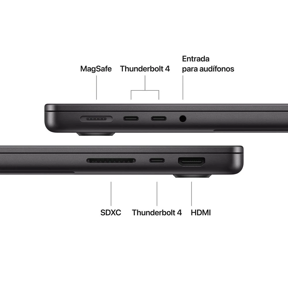 CONÉCTATE CON TODO — El MacBook Pro viene con tres puertos Thunderbolt 4 y un puerto de carga MagSafe 3, ranura para tarjeta SDXC, puerto HDMI y entrada para audífonos. Y te permite conectar hasta dos monitores externos.