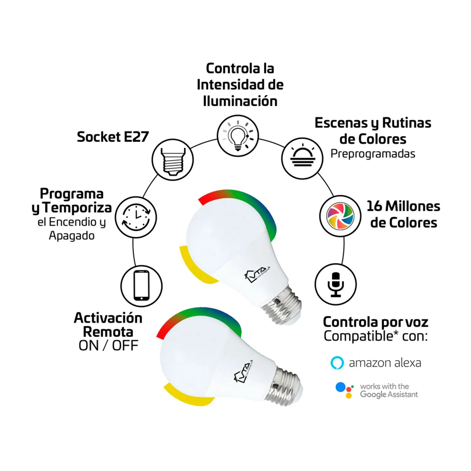 Bombillo LED inteligente ahorrador, con activación remota por aplicación, ccomplatible con asistentes de voz como Google Home, Alexa y SIRI shortcuts. Cuenta con chat en línea de soporte técnico en la aplicación VTA Casa Inteligente.