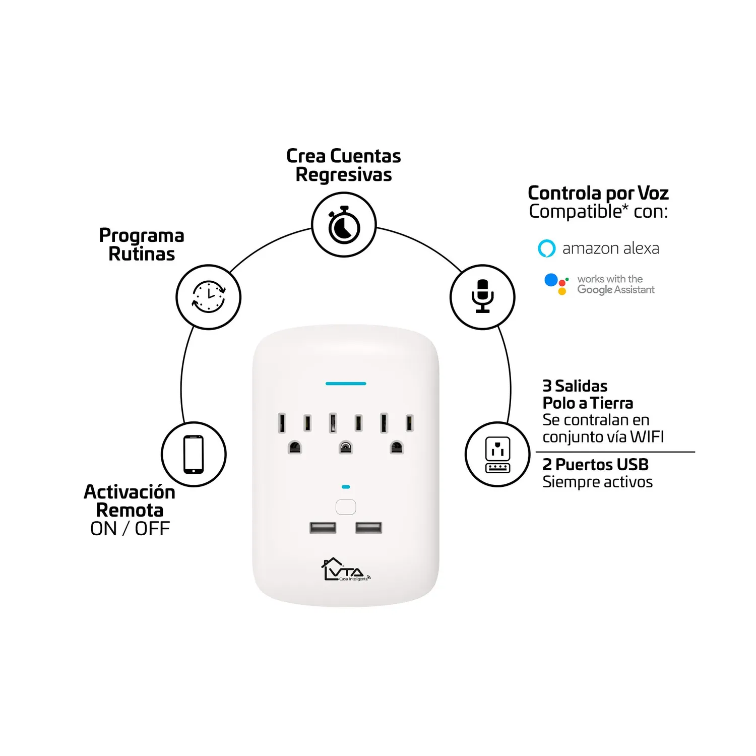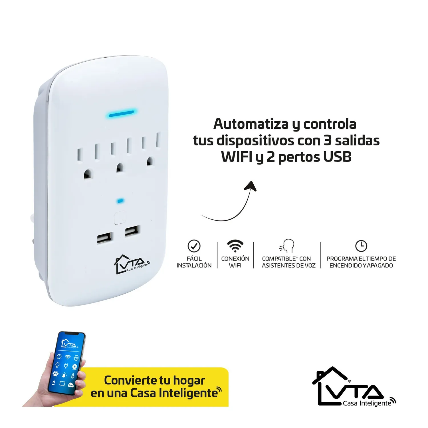 Esta multitoma inteligente opera con un voltaje de 125 V y una potencia máxima de 1875 W. Cuenta con 3 salidas y 2 puertos USB con salida de 2.1A. Su diseño compacto facilita la instalación y conexión a la aplicación móvil, compatible con dispositivos iOS y Android. La conectividad inalámbrica es a través de Wifi (Ieee802.11B / G / N) con una frecuencia de 2.4G. Incluye un indicador LED de protección contra sobretensiones y está diseñada para uso interior. Sus dimensiones son: 11.6 cm de ancho, 15 cm de alto y 6 cm de largo.